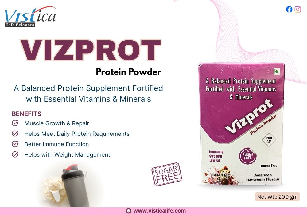 Maintaining a healthy lifestyle is no longer just about eating rightβitβs about fueling your body with the right nutrients at the right time. Vistica VizProt Protein Powder is a balanced protein supplement designed to support muscle growth & repair, better immune function, weight management, and overall wellness.